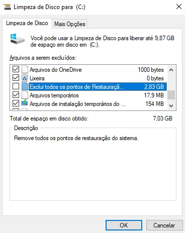 Logo após a escolha de limpar arquivos de sistema, o windows calculará novamente o espaço possível para a limpeza e mostrará uma caixa muito parecida com a primeira, com mais opções. Sugerimos escolher todas as opções com a exceção dos pontos de restauração do sistema e mandar executar a limpeza. Esse processo demora um tempo para a sua execução.