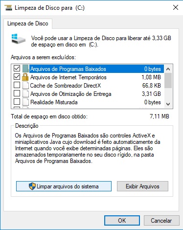 Logo após a escolha da unidade, aparece uma caixa várias opções para limpeza de disco, porém, antes de sair marcando todas as opções, sugerimos escolher a opção limpar arquivos do sistema, para uma limpeza mais profunda do sistema.