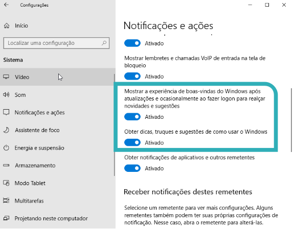 E descendo as opções você verá as opções Mostrar a experiência de boas-vindas do Windows após atualizações e ocasionalmente ao fazer logon para realçar novidades e sugestões e a opção Obter dicas, truques e sugestões de como usar o Windows. Basta apenas desativar as duas opções.